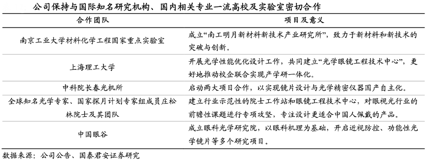 經(jīng)典案例:根據(jù)公司公告、國泰君安證券研究等綜合資訊表明,明月鏡片公司重視技術及產(chǎn)品的研發(fā),設立研發(fā)中心并制定一套完整的研發(fā)業(yè)務流程及科研項目管理流程,組建一支技術水平過硬、行業(yè)經(jīng)驗豐富的技術研發(fā)團隊。為研發(fā)更符合中國人眼球結構和用眼習慣的產(chǎn)品,公司長期保持與國際知名研究機構、國內(nèi)相關專業(yè)一流高校及實驗室密切合作。