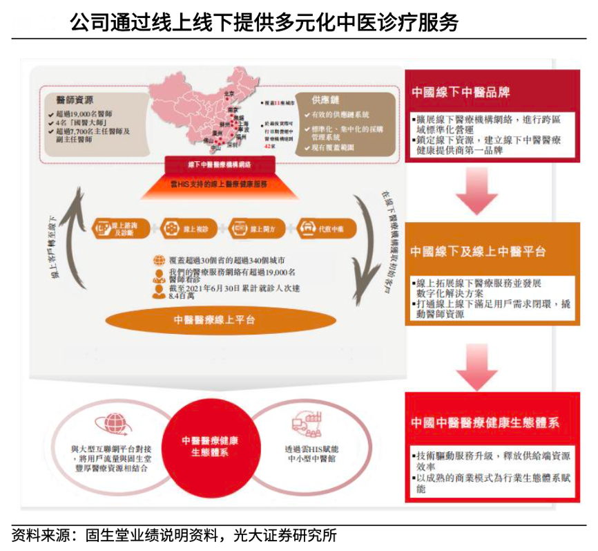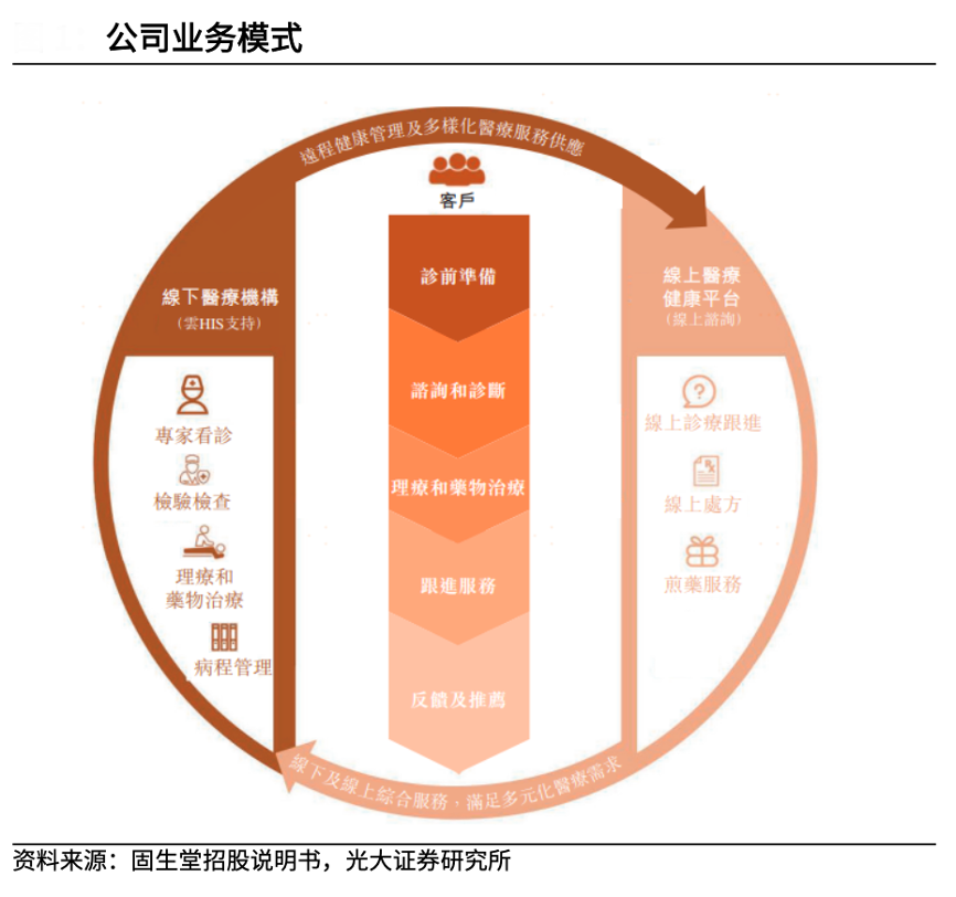 經(jīng)典案例:根據(jù)固生堂招股說明書、光大證券研究所等綜合資訊表明,固生堂以基礎(chǔ)醫(yī)療為重心,建立了線上醫(yī)療健康平臺與線下醫(yī) 療機構(gòu)相結(jié)合的中醫(yī)平臺,并將中醫(yī)和西醫(yī)結(jié)合,為客戶提供貫穿疾病診療和醫(yī)療健康管理全過程的全面醫(yī)療健康解決方案,線下醫(yī)療機構(gòu)提供專家看診、檢查、理療和物理治療等服務(wù);線上醫(yī)療健康平臺涵蓋線上診療跟進、處方、煎藥等服務(wù)。