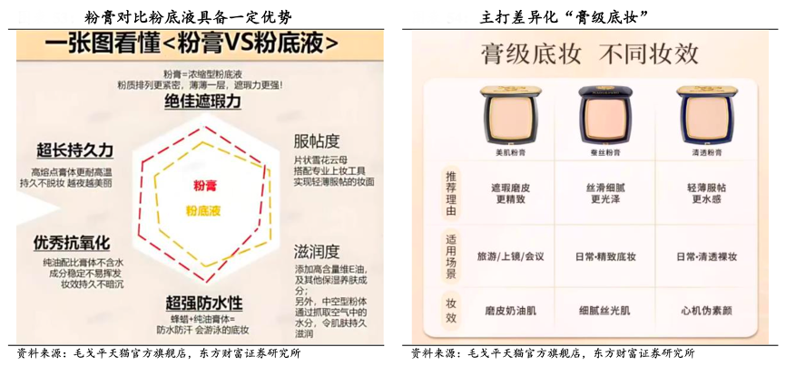 經典案例:根據毛戈平天貓官方旗艦店、東方財富證券研究所等綜合資訊表明,毛戈平公司第一款粉膏產品推出至今已經超過 20 年,獨特的產品形式為品牌的面妝產品提供了差異化于其他品牌核心底妝產品(多為粉底液、氣墊形式)的成長路徑。產品介紹提到“粉膏是濃縮的粉底液=更遮瑕、更扒臉的底妝,粉膏可作為粉底全臉使用也可以作為遮瑕局部精準疊加”,具備一定使用靈活度,也節省了單獨遮瑕的步驟,提升消費意愿。