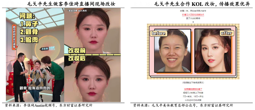 經(jīng)典案例:根據(jù)李佳琦Austin視頻號、毛戈平美妝教育總部公眾號、東方財富證券研究所等綜合資訊表明,品牌創(chuàng)始人毛戈平先生與社媒平臺、電商平臺 KOL 合作進行改妝教學(xué),根據(jù)不同改妝模特的面部情況以及改妝訴求針對性提出優(yōu)化建議,通過輕微的修改調(diào)整達到揚長避短的優(yōu)化效果,深化消費者對于創(chuàng)始人化妝技術(shù)以及理念的認可,以高專業(yè)度提升消費者對于毛戈平品牌產(chǎn)品的信任度。