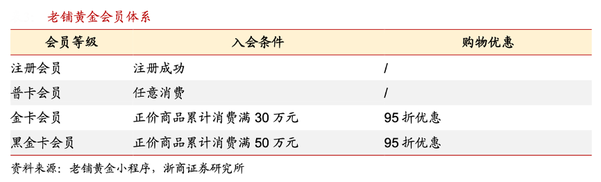 經(jīng)典案例:根據(jù)老鋪黃金小程序、浙商證券研究所等綜合資訊表明,老鋪黃金公司設(shè)置了忠誠會(huì)員制度,注冊(cè)的消費(fèi)者在購買產(chǎn)品至少一次后成為忠誠會(huì)員,公司為忠誠會(huì)員提供終身免費(fèi)清 潔及基本維護(hù)服務(wù),并為累計(jì)消費(fèi) 30 萬元及以上金額的忠誠會(huì)員提供 5%的折扣。