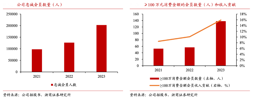 經(jīng)典案例:根據(jù)公司招股書、浙商證券研究所等綜合資訊表明,通過精準(zhǔn)把握目標(biāo)客戶消費需求和優(yōu)質(zhì)的客戶服務(wù),2023年老鋪黃金忠誠會員人數(shù)增長 60%。收入貢獻(xiàn)在 100 萬元以上的會員收入占比從 2021 年的 8.5%提升至 2023 年的 15.9%,體現(xiàn)高凈值客戶的品牌認(rèn)可度。