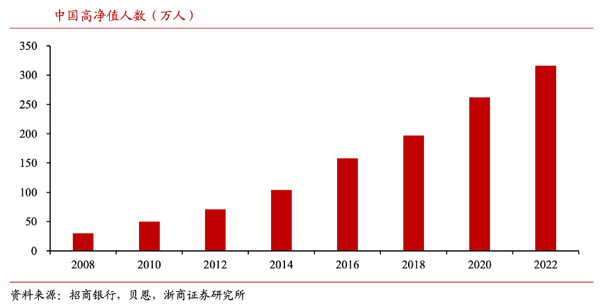 經(jīng)典案例:根據(jù)招商銀行、貝恩、浙商證券研究所等綜合資訊表明,2022 年中國可投資資產(chǎn)在 1,000 萬人民幣以上的高凈值人群數(shù)量達(dá) 316 萬人,并且客群進(jìn)一步年輕化,2023 年 40 歲以下的群體占比達(dá) 49%,相較于 2021 年的 42%上升了 7pp。老 鋪截至 2023 年底忠誠會員人數(shù)達(dá)到 20.3 萬人,在高凈值人群的滲透率為 6.4%。