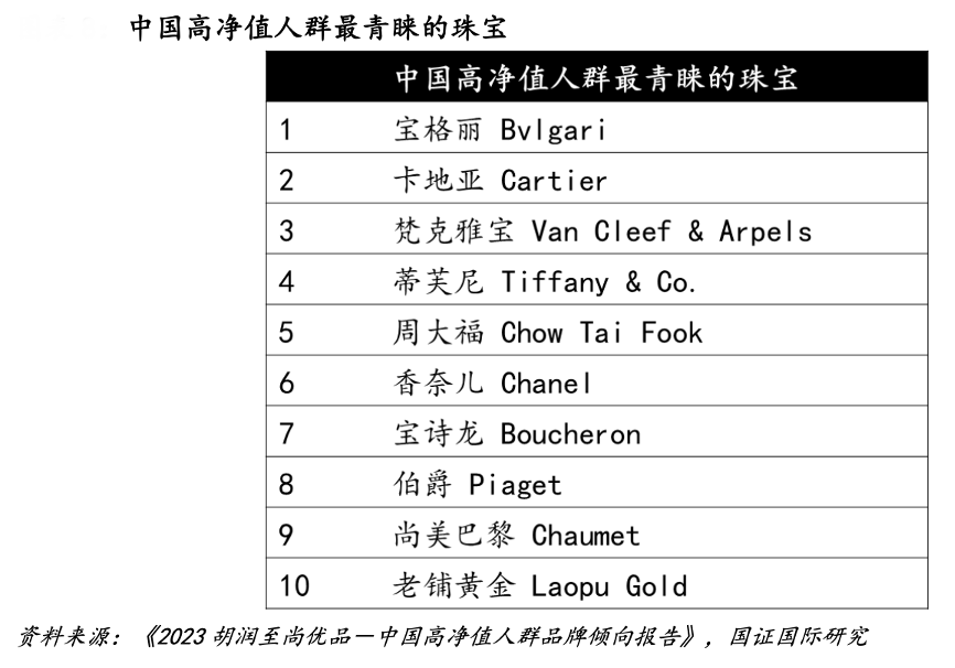 經典案例:根據《2023胡潤至尚優品—中國高凈值人群品牌傾向報告》、國證國際研究等綜合資訊表明,老鋪黃金公司品牌定位高端,根據胡潤研究院于 2023 年 3 月發布的《2023 胡潤至尚優品-中國高凈值人群品牌傾向報告》,老鋪黃金品牌與眾多一線珠寶品牌一同上榜高凈值人群最青睞的十大珠寶品牌,是僅有的兩家中國珠寶品牌之一。