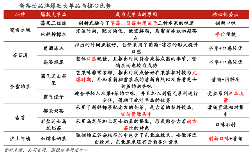 經典案例:根據公司官網、國投證券研究中心等綜合資訊表明,新茶飲的破浪出圈少不了爆款大單品在背后的支持,蜜雪冰城推出的冰鮮檸檬水以其平價便捷口感使得其成為爆款商品風靡全國,茶百道抓住茶飲融合桑葚契機,以爽口的口感與較好的營銷使其快速成為代表性大單品。
