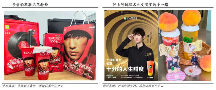 經典案例:根據奈雪的茶官網、滬上阿姨官網、國投證券研究中心等綜合資訊表明,2023 年 9 月,在周杰倫《范特西》專輯 發行 22 周年之際,奈雪的茶聯名薄盒上線范特西音樂宇宙系列聯名產品,同時還推出了 CD 造型的杯墊、印有周杰倫專輯封面的不銹鋼杯子和手提袋,引發了一波打卡熱潮。在 2023 年亞運會開幕前夕,滬上阿姨就邀請了一諾擔任鮮果茶體驗官,消息已經發出一度刷屏了電競愛好者的社交媒體。