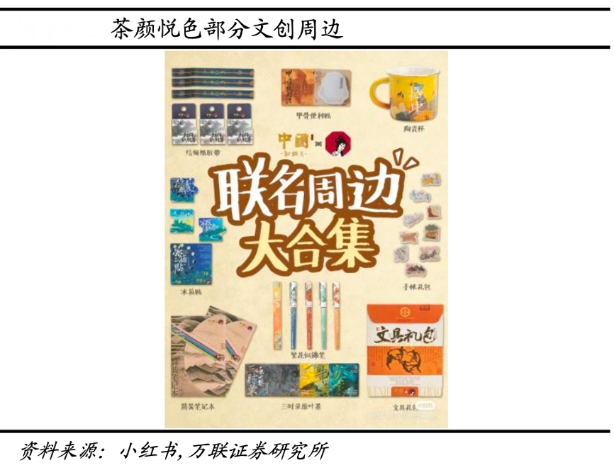 經典案例:根據小紅書、萬聯證券研究所等綜合資訊表明,除現制茶飲銷售之外,茶顏悅色還創立了單獨的零售品牌店“知乎,茶也”,擁有自主設計的文創產品,出售包括茶杯、雨傘、旅行杯、手機貼、拼 圖、車線本、明信片等涉及日常出行的周邊產品,以此滿足年輕人多元化的個性訴求, 實現“好茶味”和“潮文化”的完美融合。