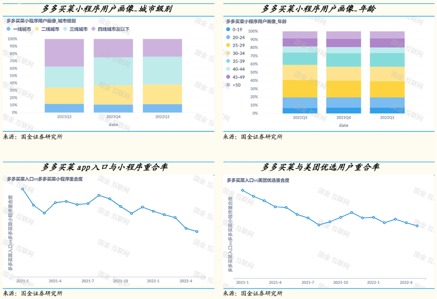 經(jīng)典案例:根據(jù)國(guó)金證券研究所等綜合資訊表明,多多買菜在拼多多 App 首頁(yè)的中心位置,從首頁(yè)入口的社區(qū)團(tuán)購(gòu)活躍用戶規(guī)模約為拼多多整體用戶規(guī)模的21%,多多買菜的 App 首頁(yè)入口活躍用戶規(guī)模和小程序活躍用戶規(guī)模比例約為 3:1,用戶習(xí)慣逐漸養(yǎng)成,兩個(gè)渠道的用戶重合度逐漸下降到20%,多多買菜和美團(tuán)優(yōu)選小程序用戶重合率近半年逐漸降低。