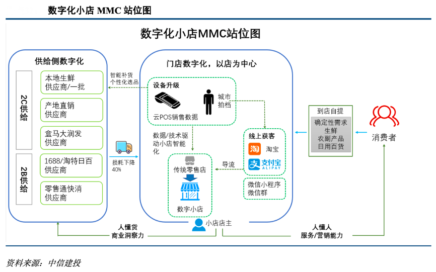經典案例:根據中信建投等綜合資訊表明,相比于美團的線下地推以及多多買菜的社交裂變,阿里依托零售通背后下沉市場的 100 多萬實體門店資源,一方面將門店數字化,通過淘寶、支付寶完成線上獲客,另一方面其在選品和供應鏈上更加面向下沉市場,固定經營場所增加服務確定性,穩定的鄰里關系提供個性化分層服務,數字感知設備入場能讓小店聚攏規?;枨螅床干a端,有利于建立基于下沉市場小店模式的社區團購。