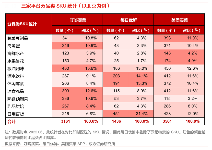 經典案例:根據叮咚買菜、每日優鮮、美團買菜APP、東方證券研究所等綜合資訊表明,在商品品類結構方面,叮咚主打自有品牌提高客單價,多速食凍品、熟食預制菜、乳品烘培品類商品,其合計 SKU 占比約為 31.6%,而美團買菜 SKU 品類結構相對均衡,傳統生鮮占比相對較高,其在戰略上維穩平衡,提高客單價更多依靠向用戶提供豐富均衡的品類選擇。