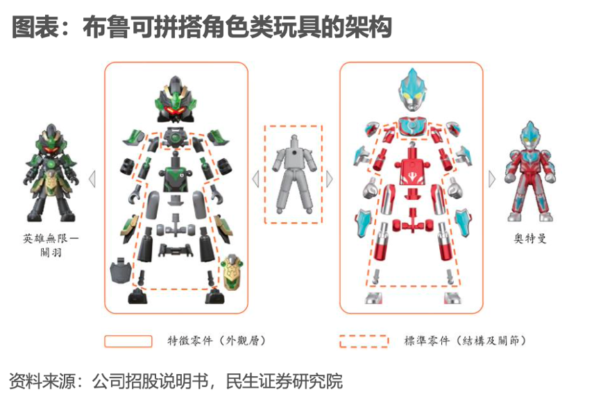 經典案例:根據公司招股說明書、民生證券研究院等綜合資訊表明,布魯可的拼搭角色類玩具從人體結構中汲取靈感,以實現穩定性、可動性和外觀的模仿。通過標準零件和特征零件的組合,布魯可能夠還原出具有高度定制性和細節的角色。
