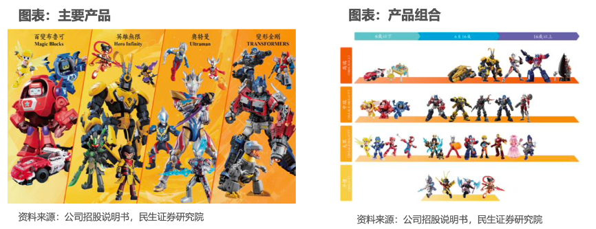 經典案例:根據公司招股說明書、民生證券研究院等綜合資訊表明,布魯可抓住市場機遇,致力于通過布魯可創新體系,創造全球領先的拼搭角色類玩具,滿足消費者對互動體驗及IP角色還原的普遍需求。布魯可構建了網格化的廣泛產品組合,包括豐富的SKU、完整的價格帶和多樣的IP矩陣,為消費者提供了豐富的選擇。截至2024年3 月31日,布魯可共有391款在售SKU,覆蓋不同年齡段。